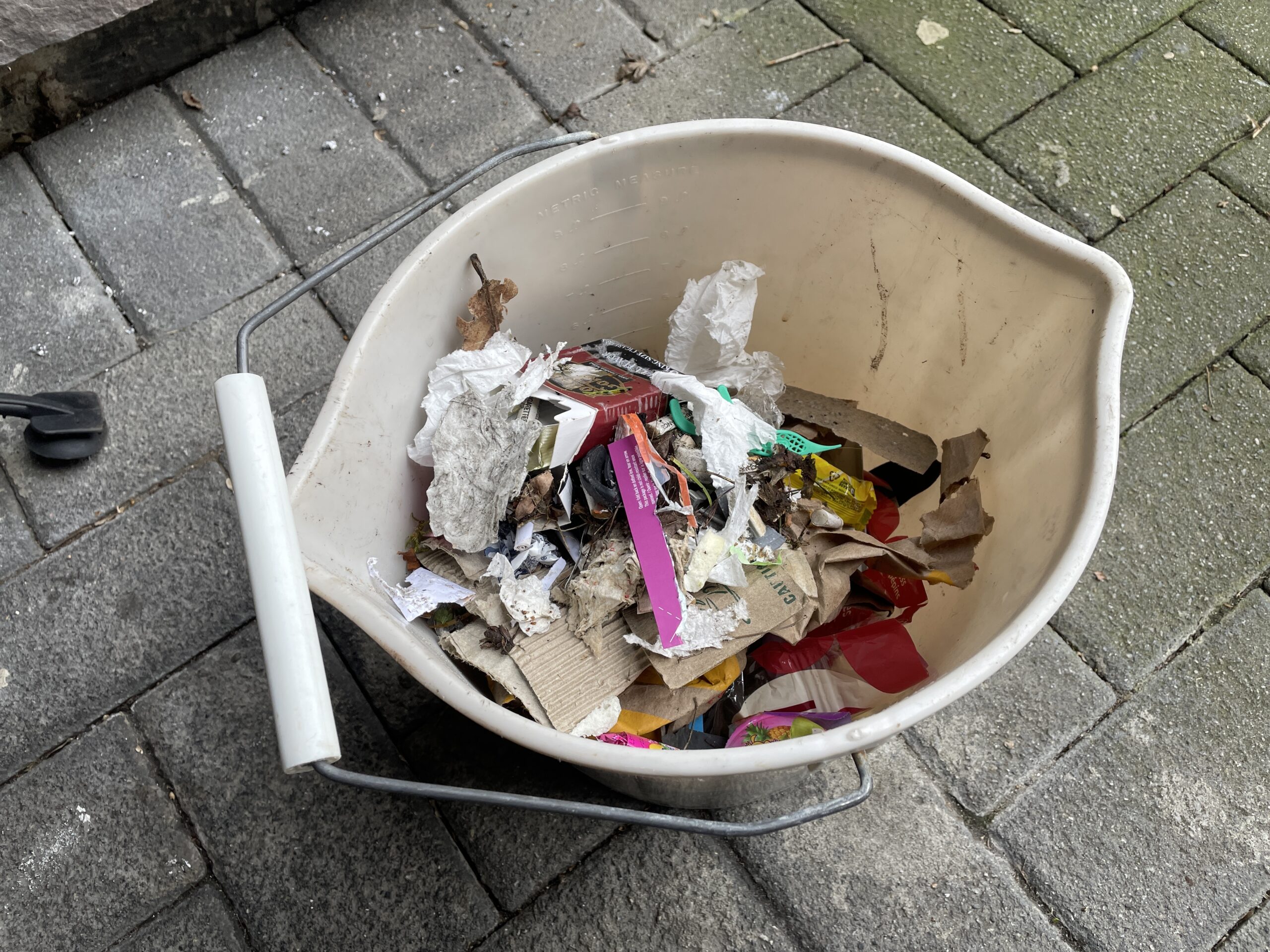 And here’s a bucket of the stuff I picked up today. When I do a litter pick-up, this is what I usually cover (and did cover today):
