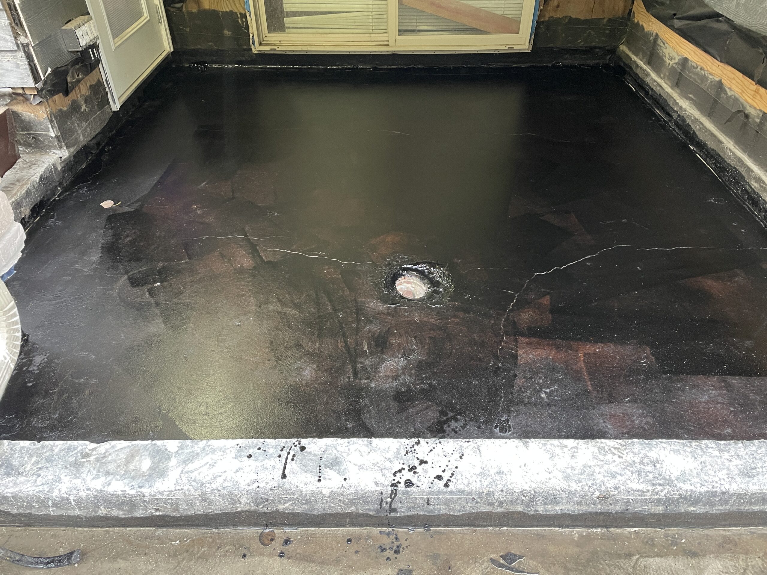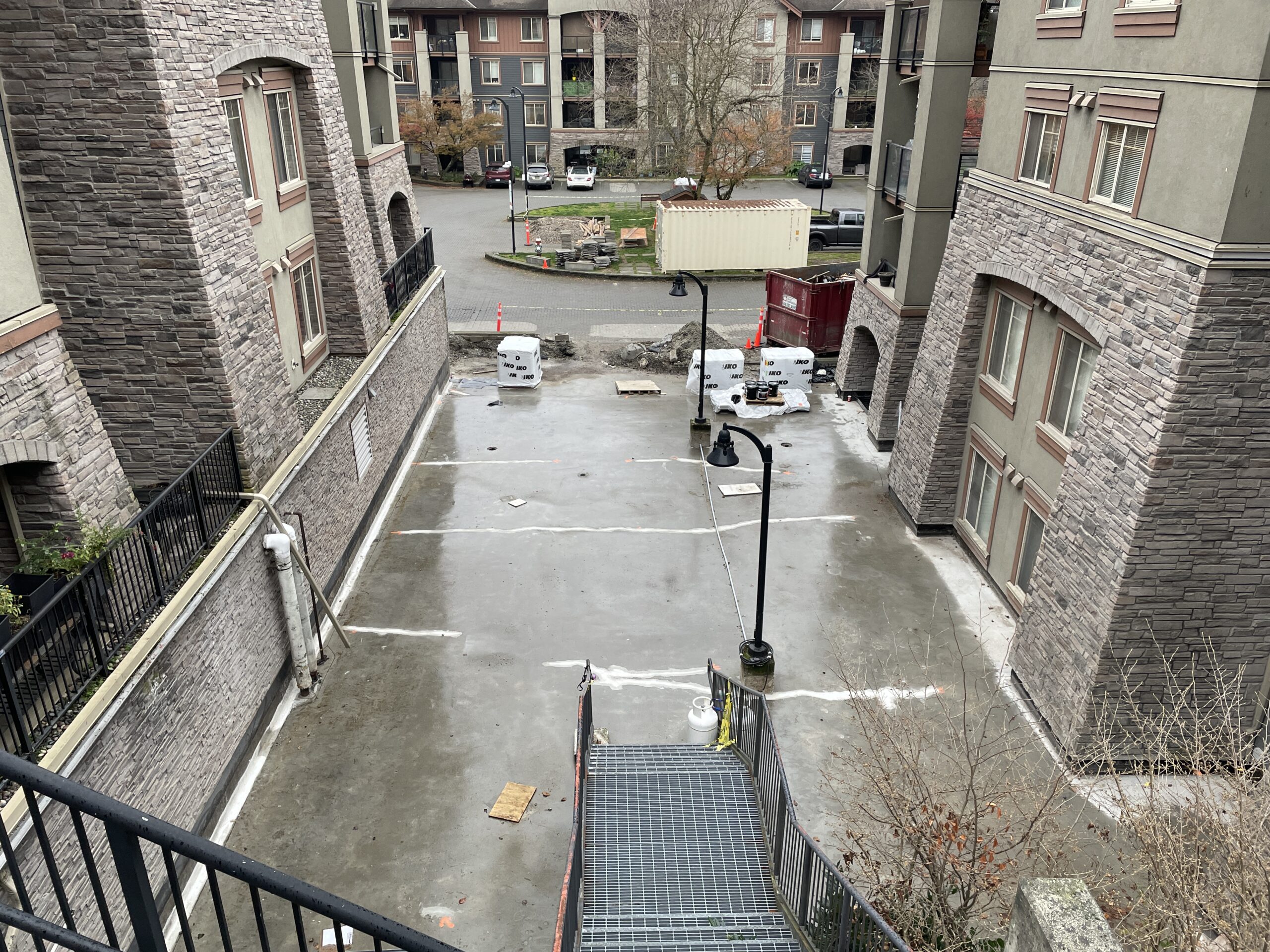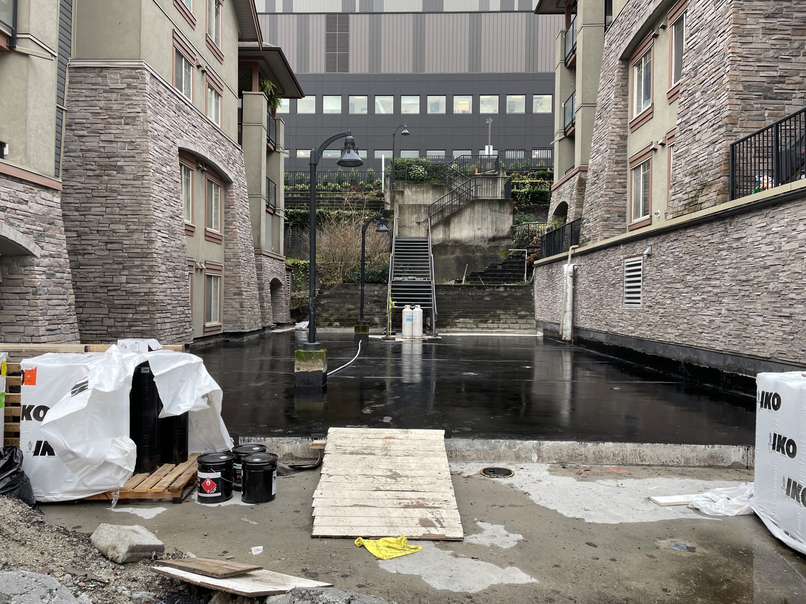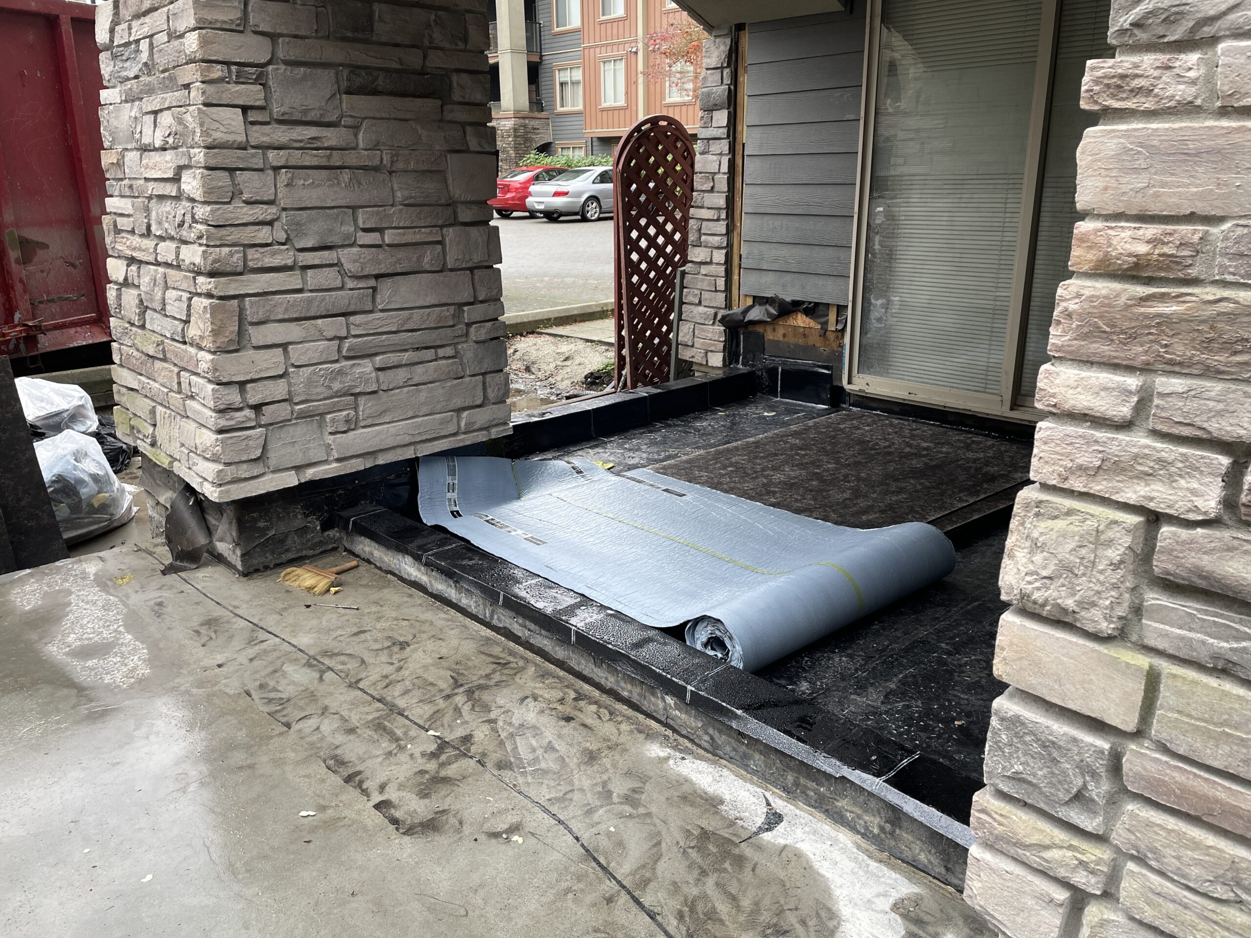 Continued work on installing membrane on the five affected patios.