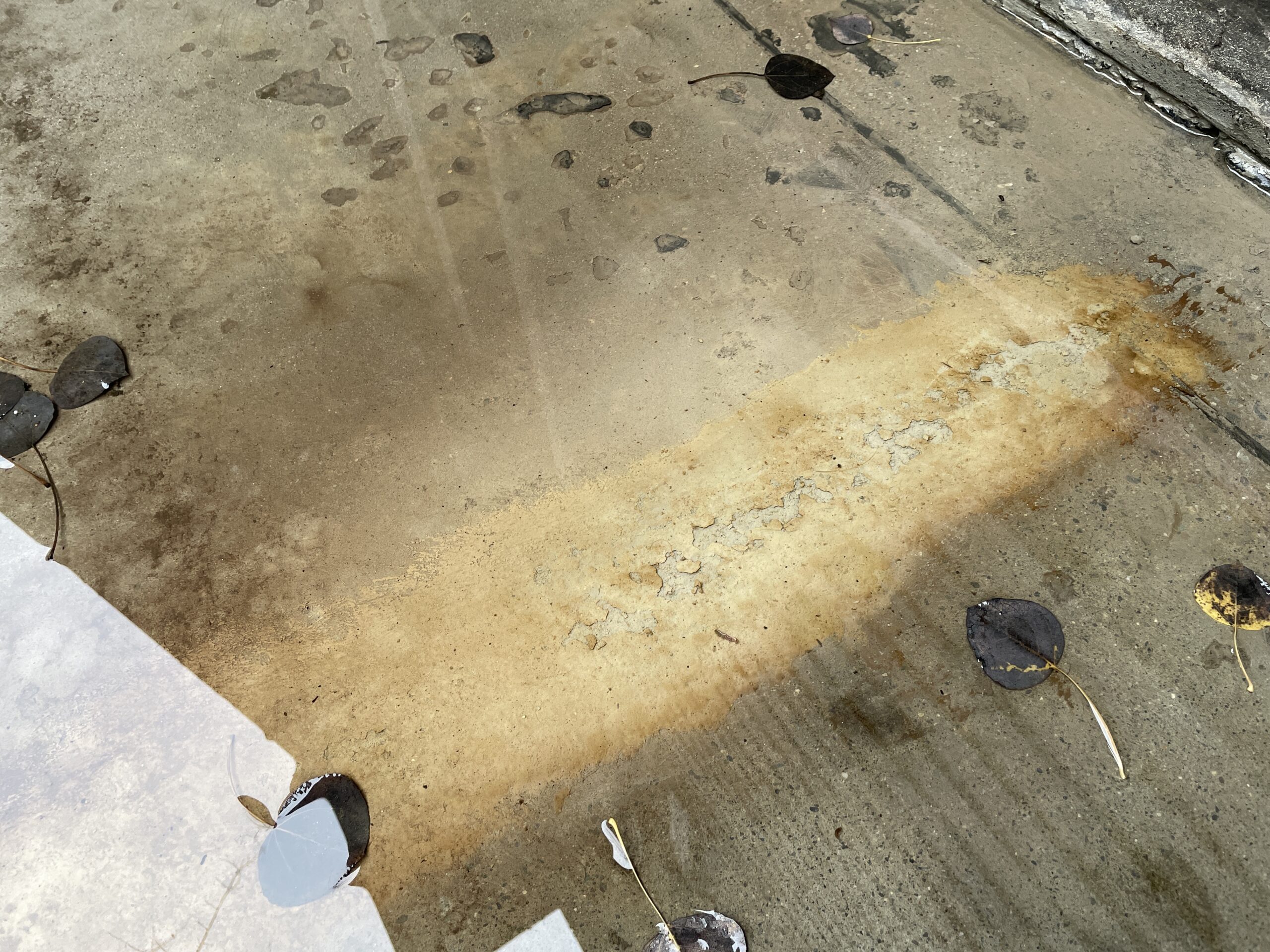The following shot is of a crack repair behind the 244 building. While the concrete curb and other crack repairs were covered with plastic for several days after the work was done, this crack was left exposed. This shot, taken on November 14, shows how the crack is both partially submerged under standing water and how the Krten Krystol mixture is starting to flake off.